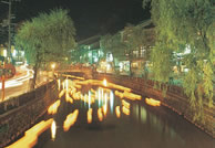 石造りの太鼓橋がかかる小さな川と柳並木は城崎温泉の代表的な風景です。温泉街には7軒もの外湯が点在し、それぞれ趣の違う温泉浴を楽しめます。